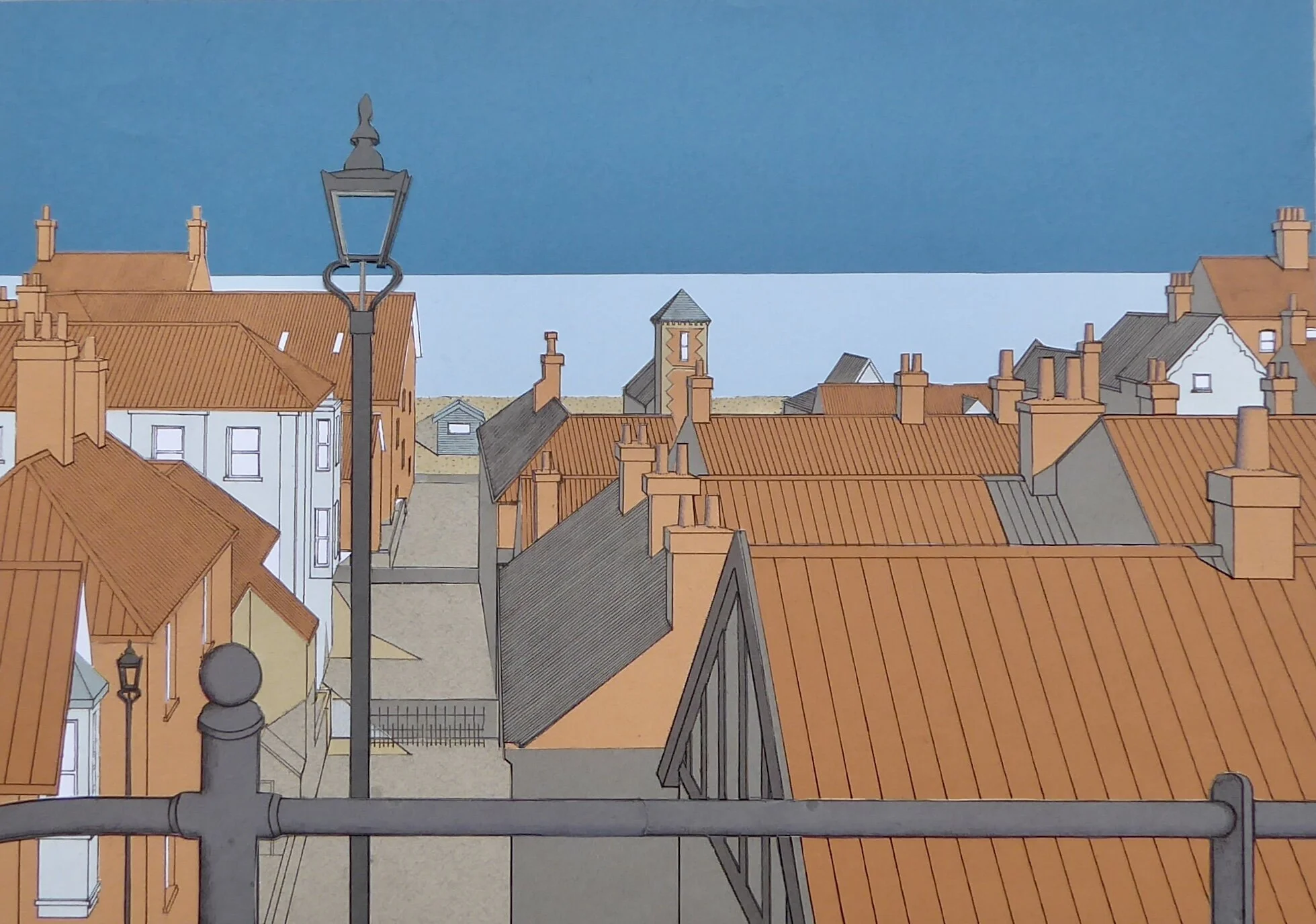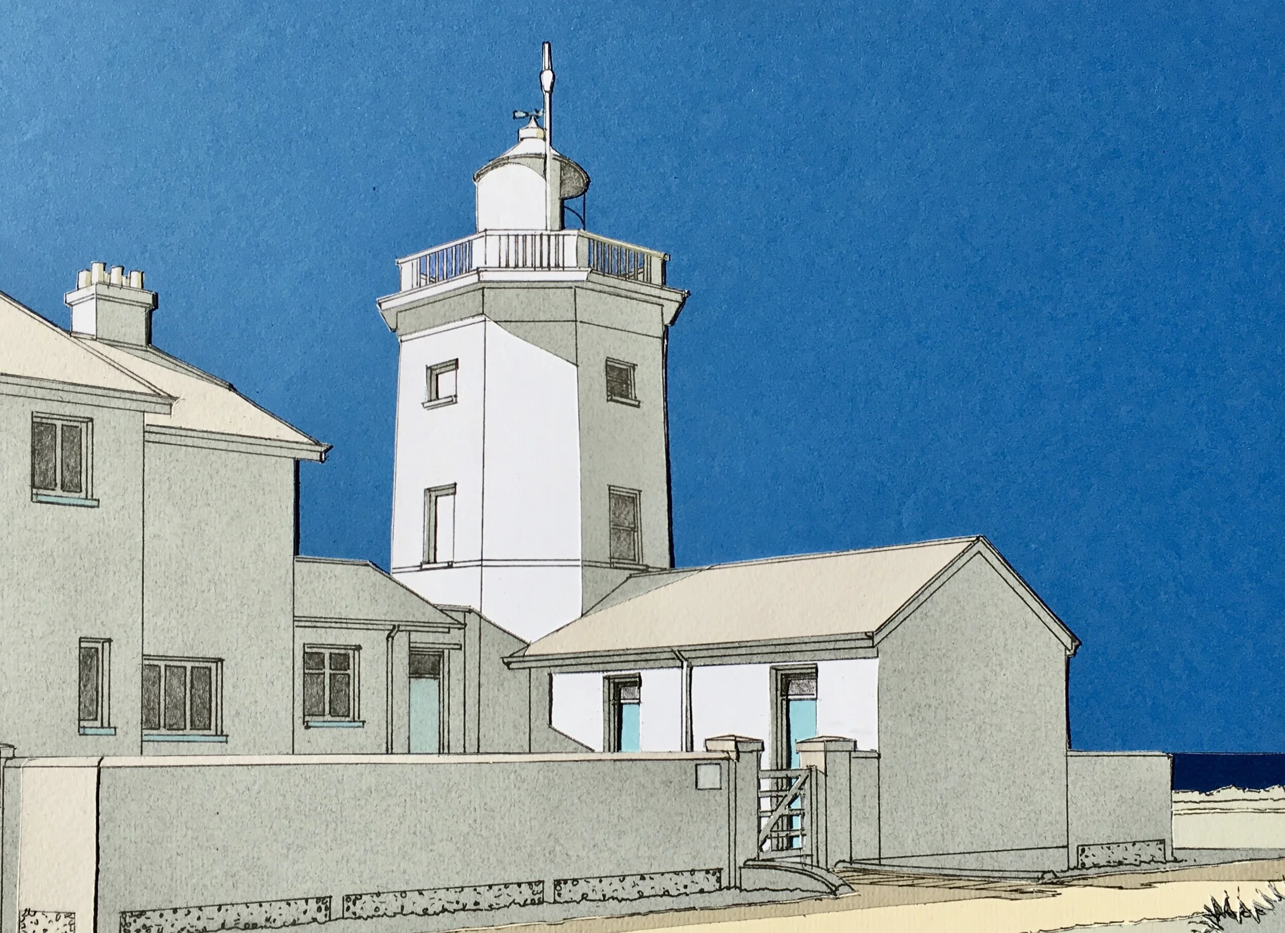 Buildings commonly feature, though perhaps less well known, often as groups and usually in their setting. By contrast landscapes provide a more fluid subject matter where coastal or riverside views are favoured. Formats vary from panoramic and rectangular, to square and vertical.