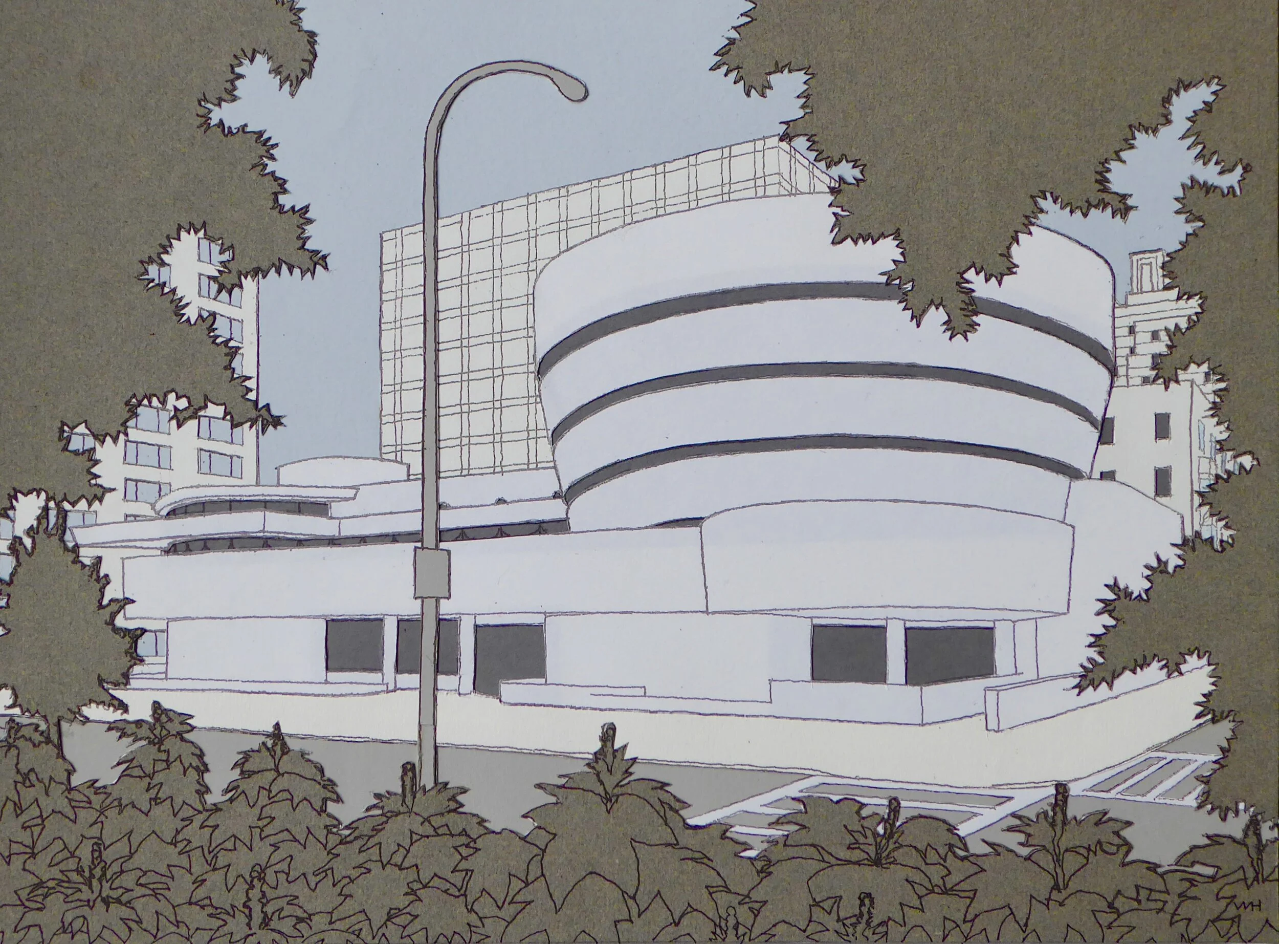 Colour effects were initially limited to watercolours, crayon colouring or oil pastels. More recently artwork has used a colour collage technique to complement the line drawing. Here the drawing is printed onto coloured sheets which are selectively cut and mounted in layers. Shading lines or darker colours are often used to give depth along with a strong perspective, in contrast to the two-dimensional more abstract quality of other images.